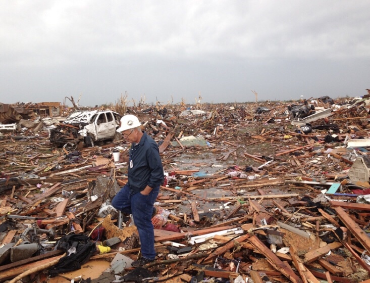 Statistics from that day recall that this wasn’t just ANY tornado, it was an EF5, the biggest and baddest of all types of tornadoes, with wind speeds of 210 mph. It had a path of 14 miles that chugged along on the ground for 40 painstaking minutes with a wedge shape over ONE MILE WIDE . It was leveling everything in its path. This was the first time I had EVER heard a meteorologist say “If you aren’t below ground you aren’t safe.”